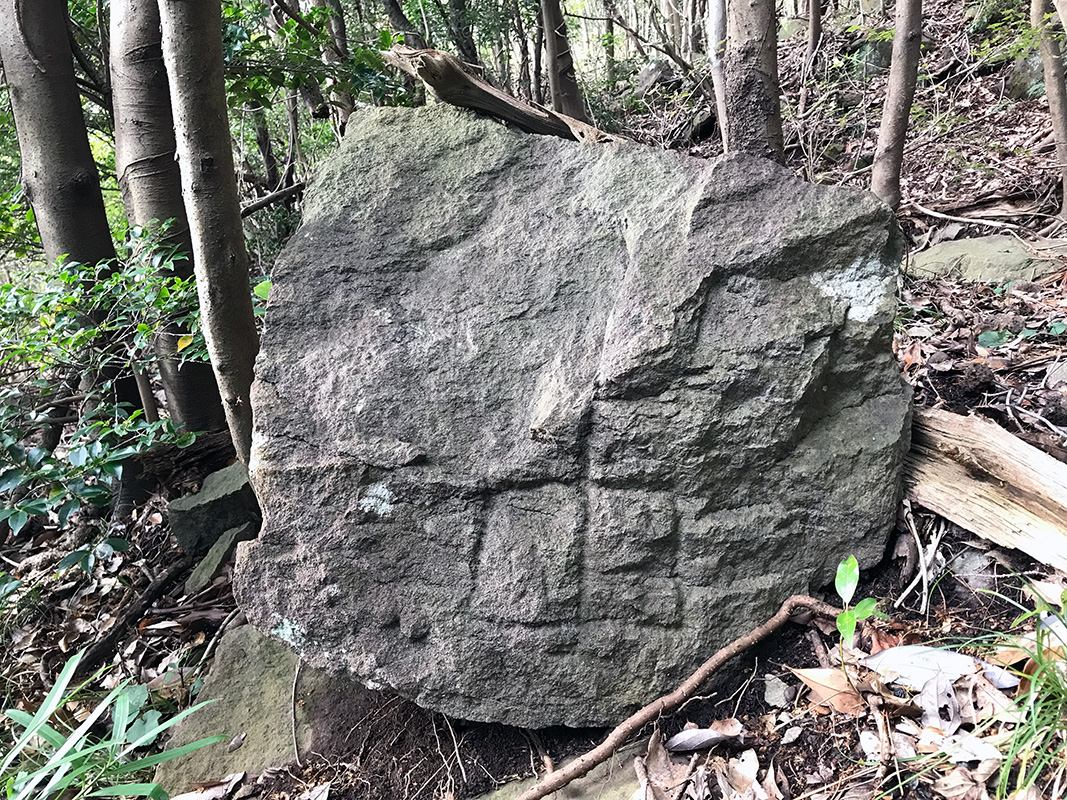 ロープに導かれた石丁場への探索コース脇に石鑿跡を残す石材が目に飛び込んできました。 最初は石鑿跡の一部しか見えていませんでしたが、刻印であることは遠目からもはっきり確認できたのです。 以前の潜入時には全く気が付かなかった刻印石。 刻印は中張窪・瘤木石丁場でよく目にすることができる轡紋です。