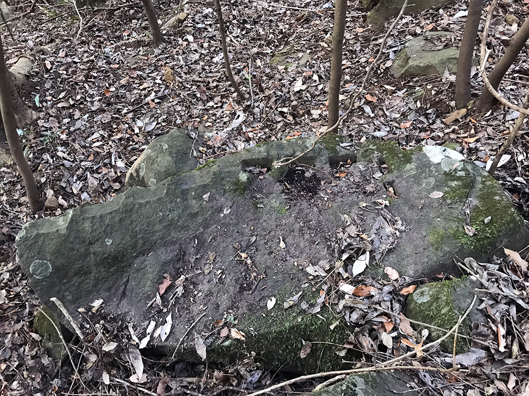 石材成形のために切り落とされた細かな石材が点在する中に残る矢割石です。