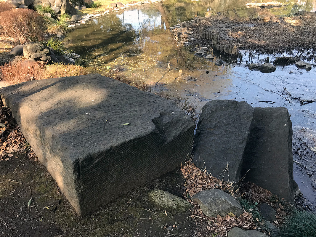 石鑿で表面を綺麗に加工された石材と矢割跡が残された石材です。
