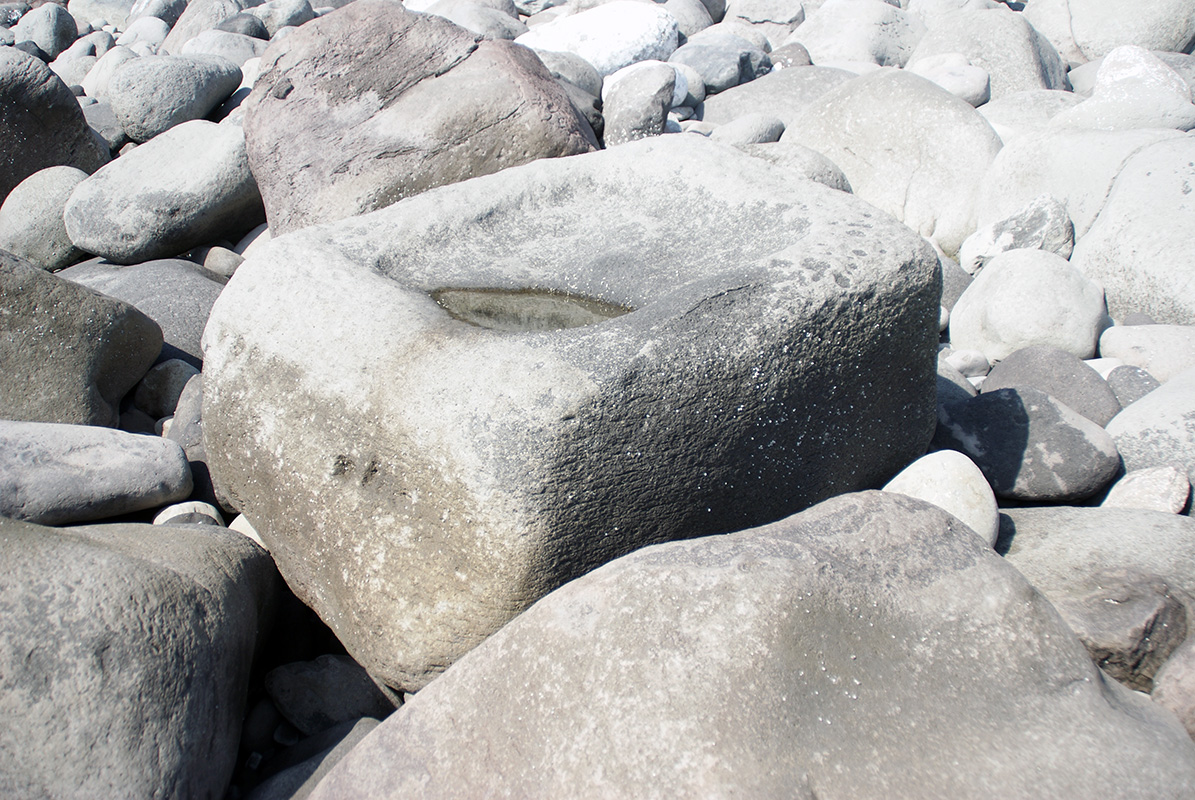 高さ約100cm、長さ約160cm。 不思議な石を見つけました。 東伊豆町稲取地区、磯脇石丁場付近の磯丁場にて 積載船に石を運び入れるために組んだ櫓の柱を支えた礎石が発見されています。 払海岸磯丁場でもあるはずと探していたところ、 この石を見つけたのです。 小口に僅かに残る矢穴跡。 上面に残る四角い凹み。 用途不明の石材です。