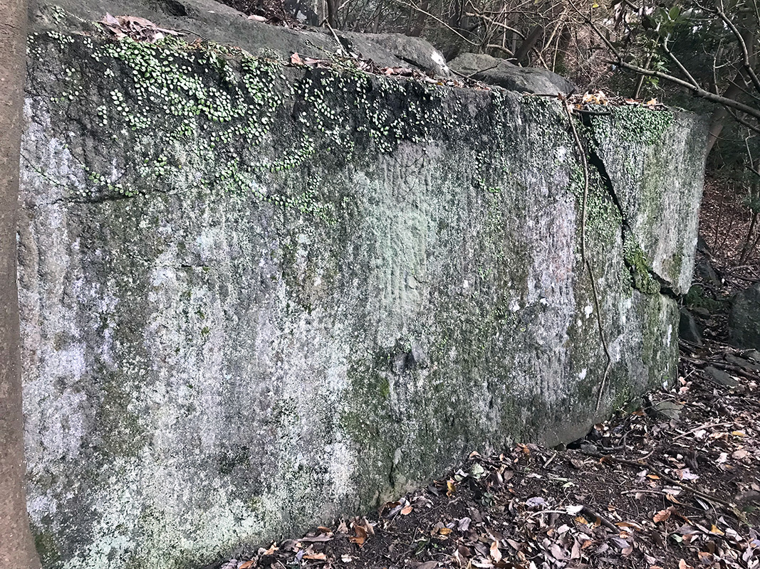 斜面側の表面は石鑿で整形されています。 江戸城の築城石採石では角石(城郭角に配置する石)、角脇石(角石横に配置する石)の寸法は、 幕府からの通達で厳格に決められていました。 この石材は角石、角脇石とするには大きすぎます。 おそらく、定められた大きさに整形するのでしょう。 写真右側、斜めに入った割跡はサイズ調整の際、思い通りに割れなかったのでしょう。 また、石材下部に見える矢割跡は 背後の母岩から切り出された後、回転させて現在の位置にされた事を物語ります。