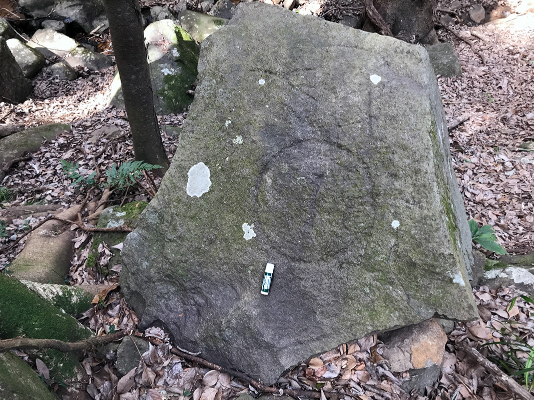 桜ヶ洞石丁場内で複数確認されている「○」に「一」の刻印と「団扇紋」です。