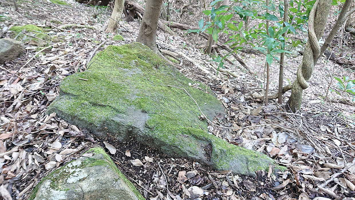 「火箸紋」「五徳紋」が刻まれた切出し残石の傍ら、大型矢穴跡を残す残石が点在しています。