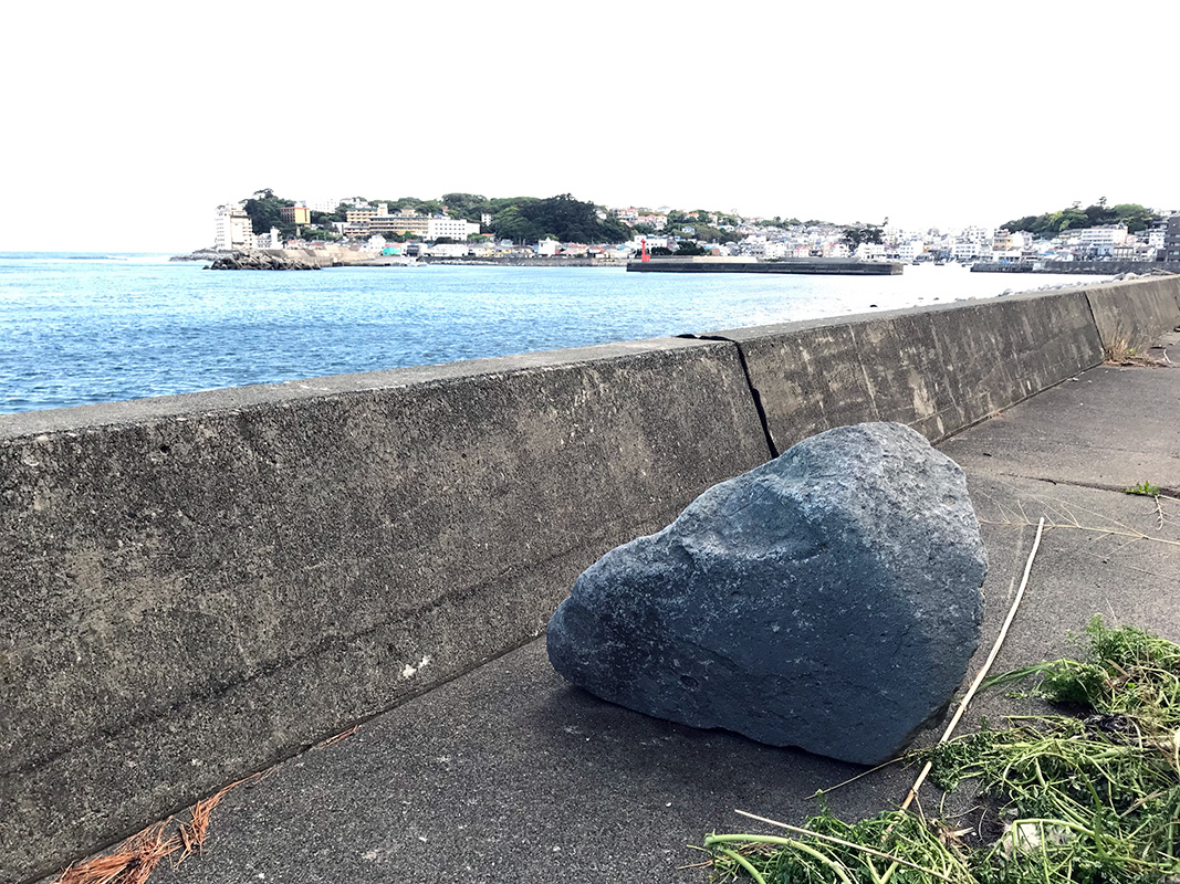 岩体幅約1mの巨岩です。 台風の大波により、防波堤を乗り越えたのでしょうか? 遊歩道沿いの家人によると、2017年10月の連続台風襲来時、幅僅かな用水路は瞬く間に詰まり、 防波堤の高さまで海水で満たされたということです。 満たされた海水に新たなウネリが押し寄せ、家の石垣に波が当たり一部破壊されてしまったと話されていました。 自然の力は凄まじいモノです。
