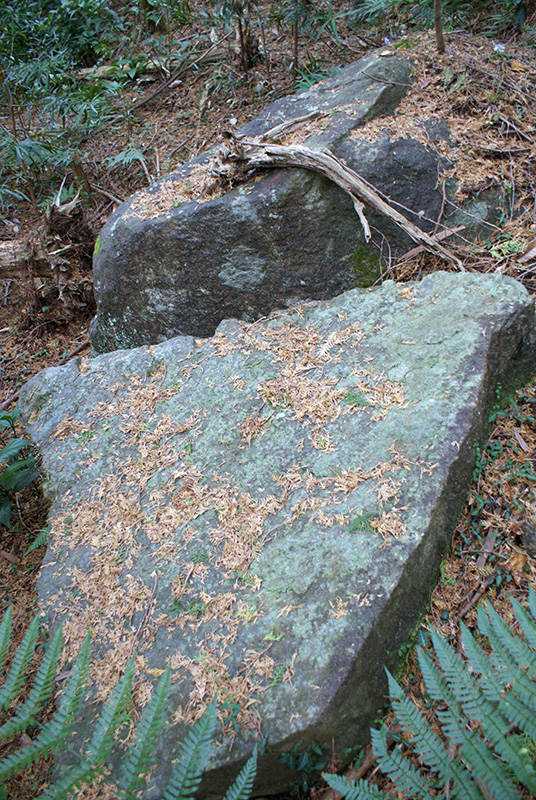 寺山石丁場への潜入後、沢沿いに姿を見せる最初の割石。