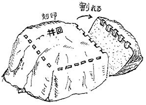 築城石を採石する際、山や沢にある自然石に小さな穴を並べて掘ります。開けられた穴を矢穴(箭穴)といい、石工の労賃は箭穴に入れたお米の量とされていました。 この穴の上辺が長さ100mm前後が慶長期、80mm前後が元和期、60mm前後が寛永期と云われています。矢穴を掘る際、石鑿で付けた目安の直線上の線跡が現在でも複数見つかっています。 ![]() ![]() 巨石を割るためには、開けられた矢穴に「樫の木」の楔(くさび)を打ち込み水を掛けておきます。やがて楔が膨張し、石が割れる仕組みとなっています。巨石が割れた状態を大割りと云い、割れた石を矢割り石と云っています。その後、石鑿で成形表面を仕上げて築城石としました。 イラスト資料/東伊豆町稲取・岡田善十郎氏 |